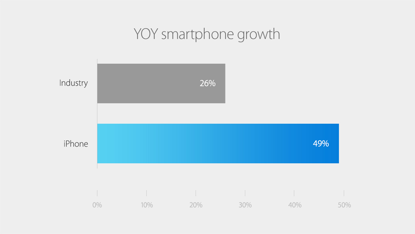 iPhone 和 ApplePay 就直接浓缩成了一道副菜,通报一番数据基本搞定,iPhone 产品历代的累积销售量已经达到了 7 亿台,iPhone 销售增长率为 49%,而智能手机行业的增长率只有 26% ,Apple Pay 支持的银行已经有 2500 家并已经有 70 万个线下支付点(天朝就别想了,安心支付宝吧)。